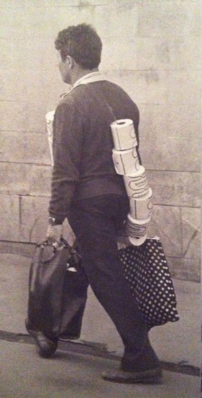Над этими гирляндами могли потешаться ("Смотри - срать идёт!"), но иначе, чем нанизав рулоны на бечёвку, их было нести неудобно. Отсмеявшись, народ срочно бежал туда, откуда пришёл этот гражданин, чтобы самим занять очередь за заветными рулончиками.
