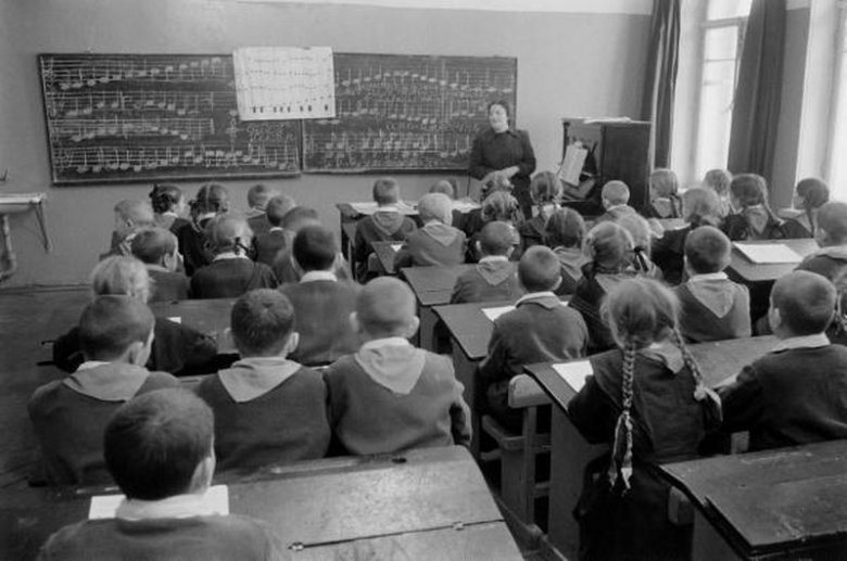 Их балбес учился, как все, в школе. Это урок пения — тогда музыкальной грамоте учили поголовно.