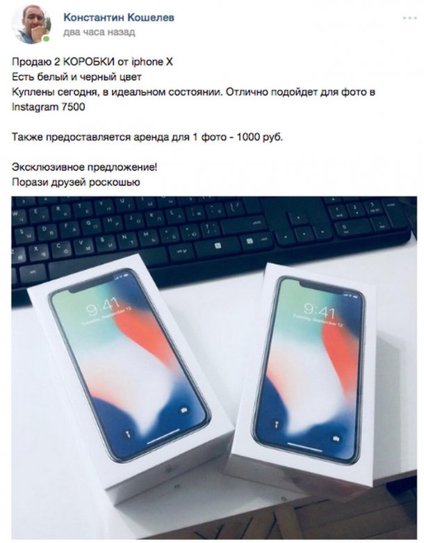 Москвич Константин Кошелев предложил в своем фейсбуке приобрести у него упаковки от iPhone X для фото в соцсетях. Стоимость пустых коробок предприимчивый мужчина оценил в 7500 рублей.
