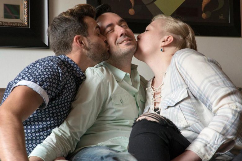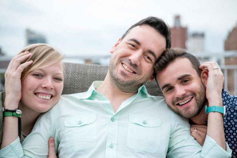 38-летний Крис и 28-летний Мэтт Брандт вместе уже восемь лет. Два года назад они встретили 28-летнюю Кейт и предложили жить с ними. Трио теперь живет вместе в квартире с одной спальней и говорит, что их отношения лучше, чем когда-либо прежде, несмотря на споры о том, кто где спит в кровати. Трио собирается усыновить детей, по их мнению любой ребенок будет "счастлив" иметь троих родителей.