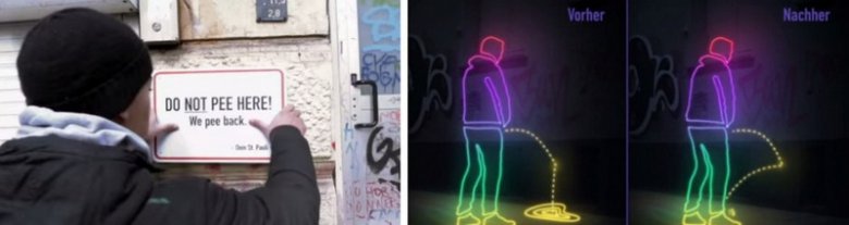 В борьбе за чистоту улиц немцы изобрели специальную гидрофобую краску, которая «возвращает» продукты жизнедеятельности на брюки и ботинки любителей справлять малую нужду на стены. Такая краска уже с успехом используется в одном из районов Гамбурга.