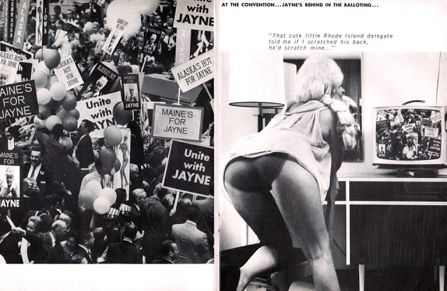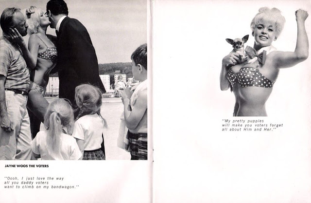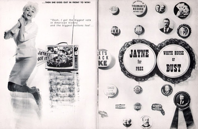 В 1964 году актриса Джейн Мэнсфилд, ослепительная платиновая блондинка с сочным бюстом, выдвинула свою блистательную кандидатуру на пост президента США. Такая новость вызвала настоящий фурор, хотя, конечно же, это был просто рекламный трюк. Дерзкий, сексуальный и нахальный PR-ход, о котором до сих пор регулярно вспоминают перед выборами в Штатах.