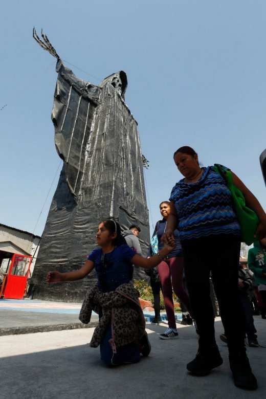На днях исполнилось 10 лет самой большой статуи смерти, которая находится в Мексике. 22-метровая статуя установлена в Храме Святой Смерти Tultitlán в центральном штате Мехико. В этот день сотни адептов культа пришли поклониться статуи, для них это оазис надежды, мира и любви. Культ Святой Смерти восходит к 1795 году, когда аборигены поклонялись скелетам в мексиканских поселках.