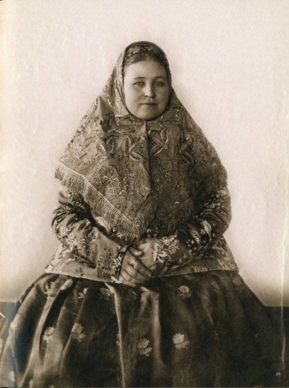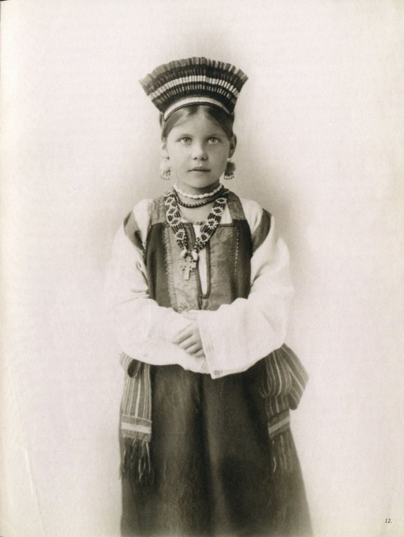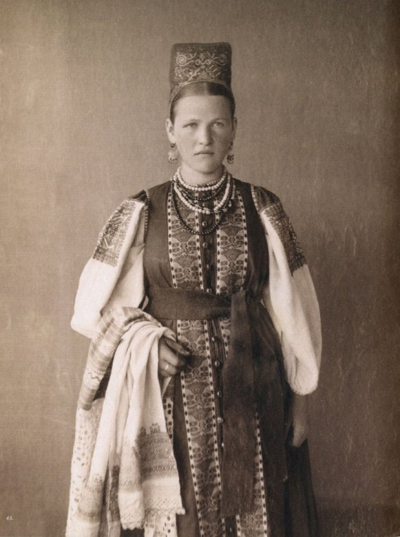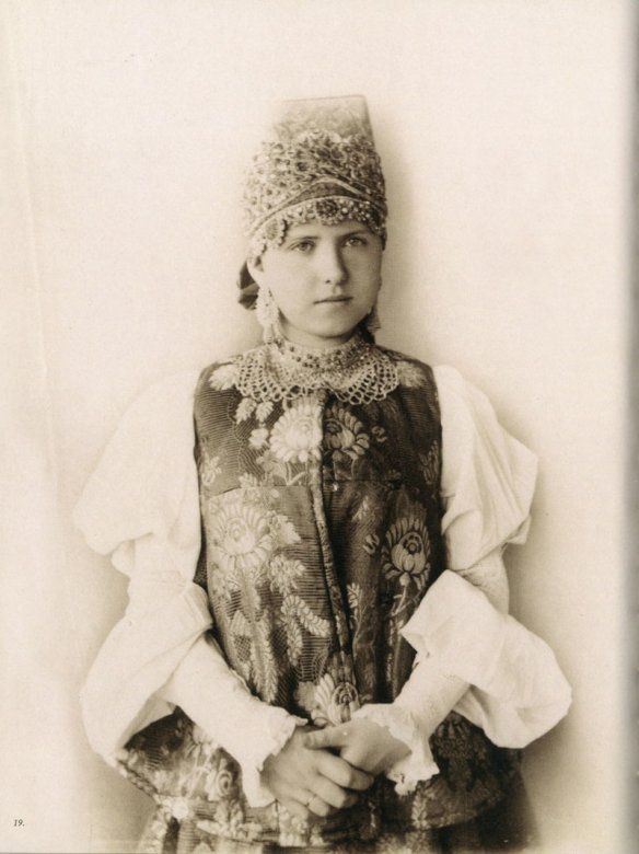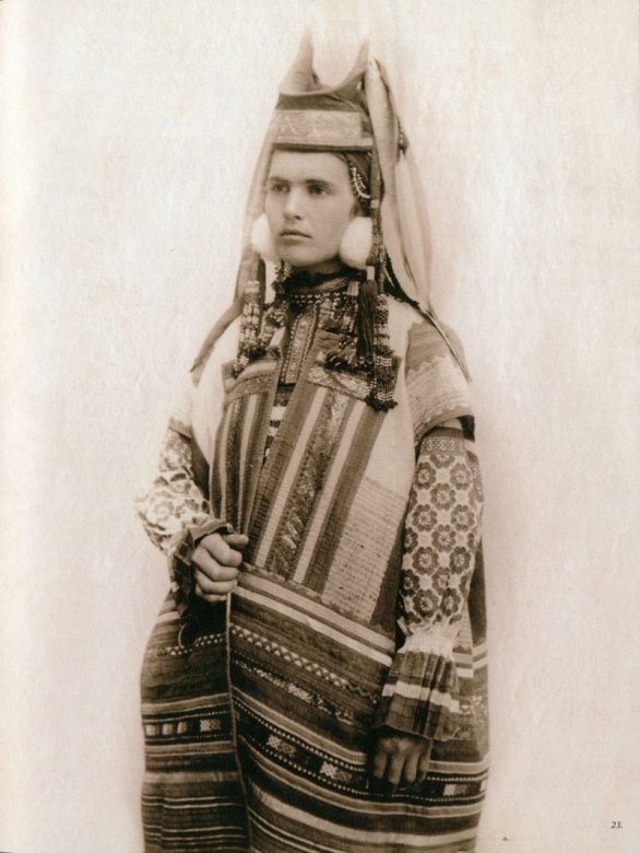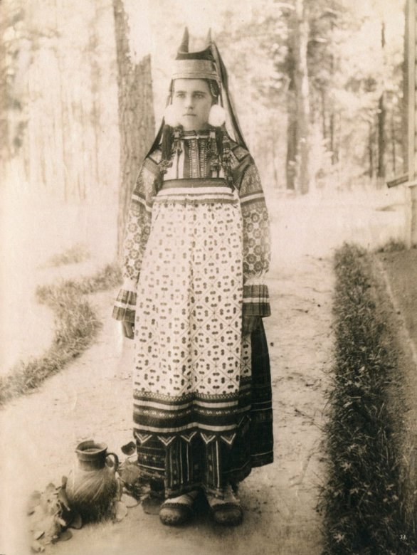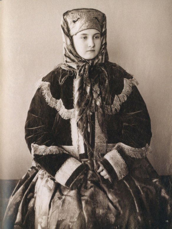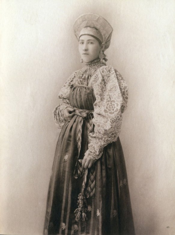 Эти фотографии сделаны в конце 19-го века и в настоящее время хранятся в коллекции Российского этнографического музея. В них запечатлены женщины в традиционных костюмах из разных регионов Российской империи. И хотя в снимках можно заметить много региональных различий, есть в нарядах два схожих базовых элемента – сарафан и кокошник.