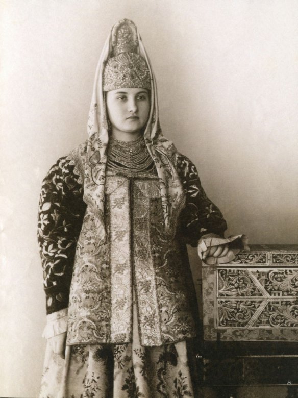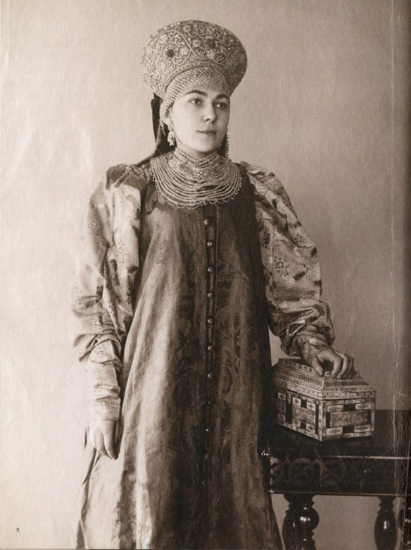 Кокошники бывали довольно экстравагантны, даже если их носили деревенские жительницы. Их могли шить из золотой парчи, дамаска или бархата, с золотой вышивкой, как правило, с растительными и цветочными орнаментами. Иногда их украшали натуральным жемчугом и драгоценными камнями.