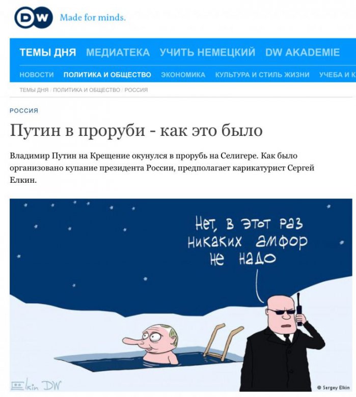 Нет, конечно не все западные СМИ поддались соблазну дать объективную оценку событию. Немецкая волна, например, проявила завидную стойкость и не смогла удержаться от «сарказма». Впрочем, здесь диагноз тоже очевиден. С одной стороны — хорошо оплачиваемы русофобия, с другой — зависть. Ведь фрау канцлерин уже давно не радует своих граждан фото в бикини или без оного)
