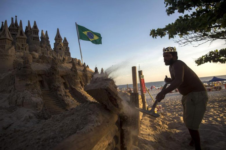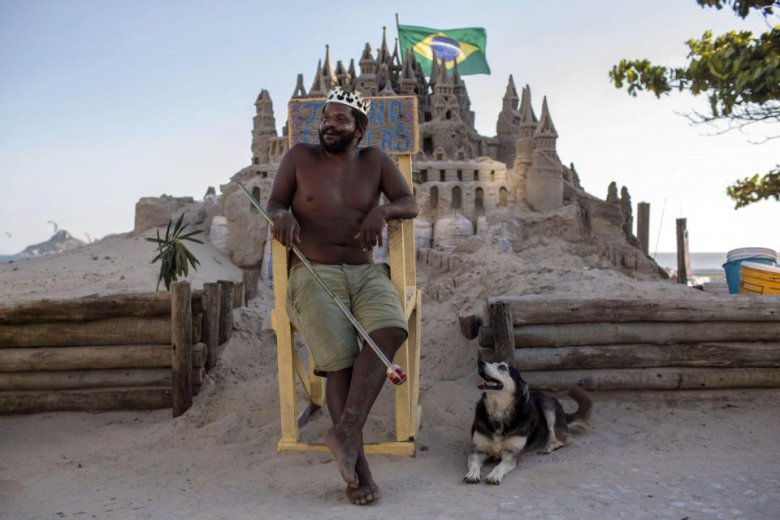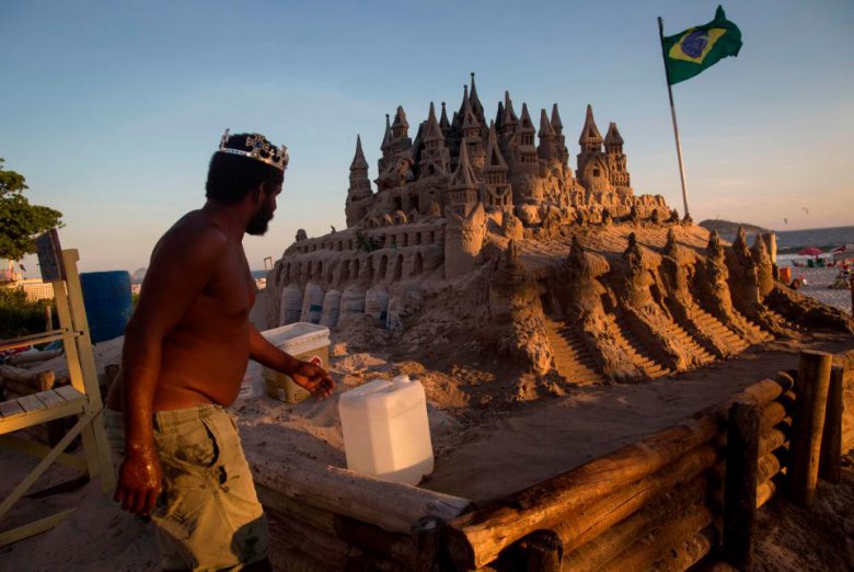 Дело в том, что замок сделан из песка. Замок построен на деревянном основании, внутри есть спаленка 3x3 метра полная книг. Марсио стал местной достопримечательностью, его прозвали "король песка". У него даже есть корона, трон и скипетр. Бразилец целыми днями ремонтирует свой замок, развлекает туристов, играет в гольф и ловит рыбу. Он доволен своей жизнью и другой не представляет.