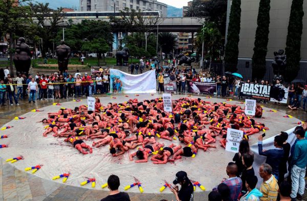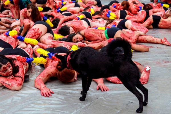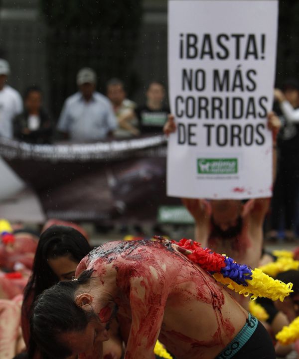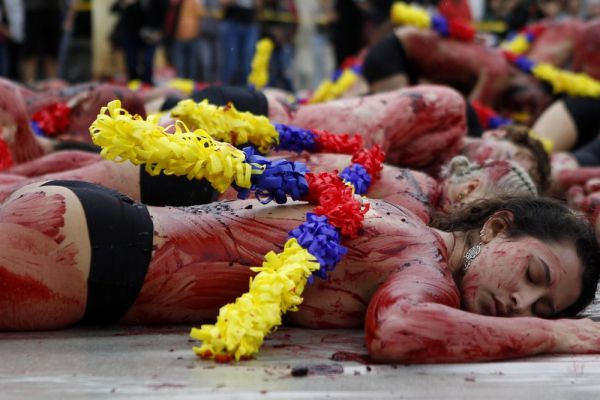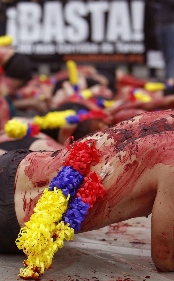 Вчера активисты организации Animanaturalis устроили протест против корриды в Медельине, Колумбия. Около 200 мужчин и женщин в черных трусах были облиты красной краской и лежали на земле. На их спинах были прикреплены бандерильи, украшенные в цвета флага Колумбии, чтобы подчеркнуть, что "не нужно делать шоу из смерти". Перформансом "В шкуре быка" активисты хотят привлечь внимание общества и требуют запрета корриды.