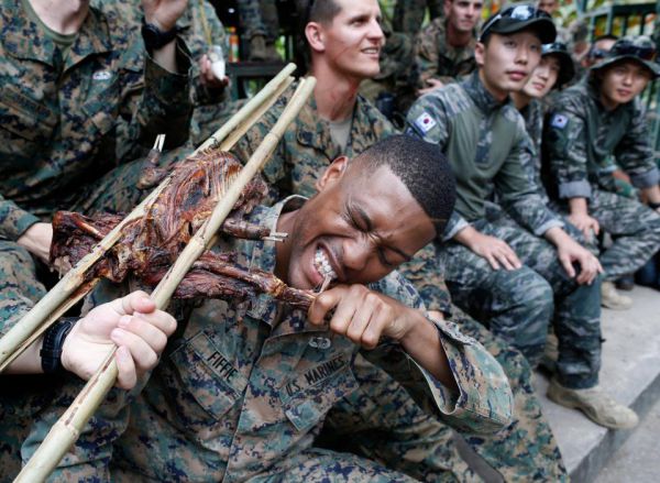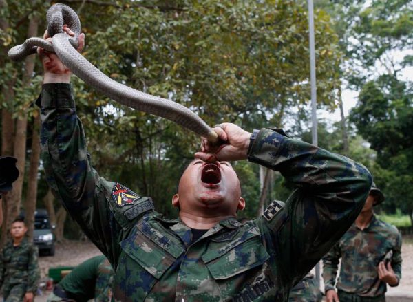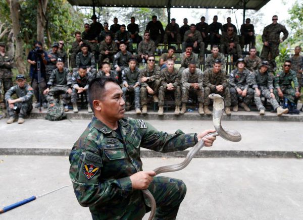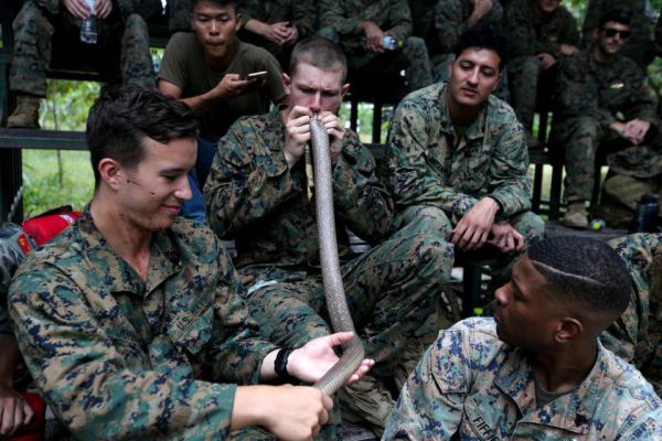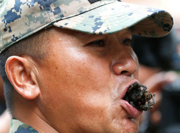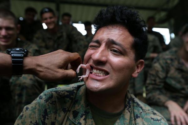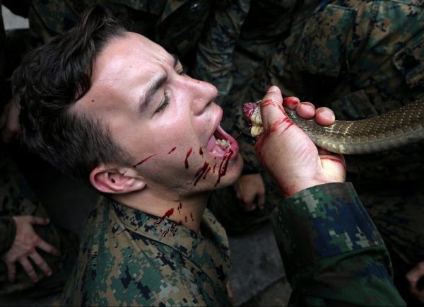 На учениях солдатам показывают как удалить яд из скорпионов и тарантулов перед едой, жарить рептилий, дают попить крови змей и многому другому.