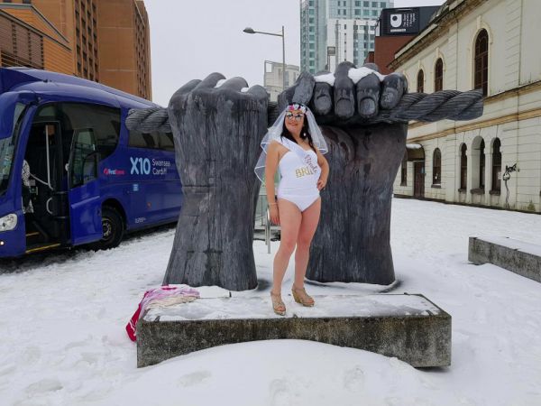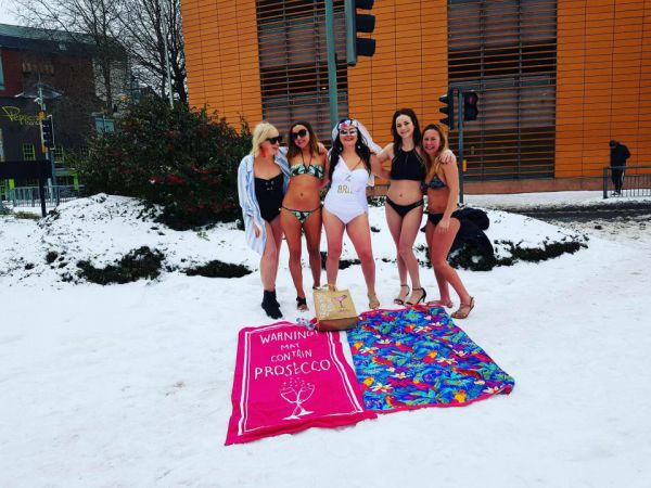 39-летняя невеста Клэр Филлипс и шесть ее подруг планировали провести выходные дни на побережье Коста-дель-Соль в Испании. Они прибыли в пятницу в аэропорт Кардиффа и узнали, что рейс отменен из-за неблагоприятных погодных условий. Менять билеты не было смысла, так как в понедельник нужно было возвращаться. Тогда, несмотря на пятнадцатиградусный мороз, девушки решили устроить фотосессию в бикини прямо на снежной британской улице, не зря же купальники тащили.