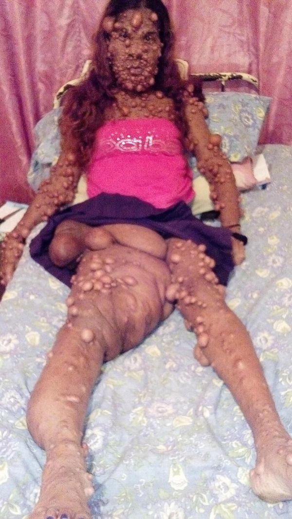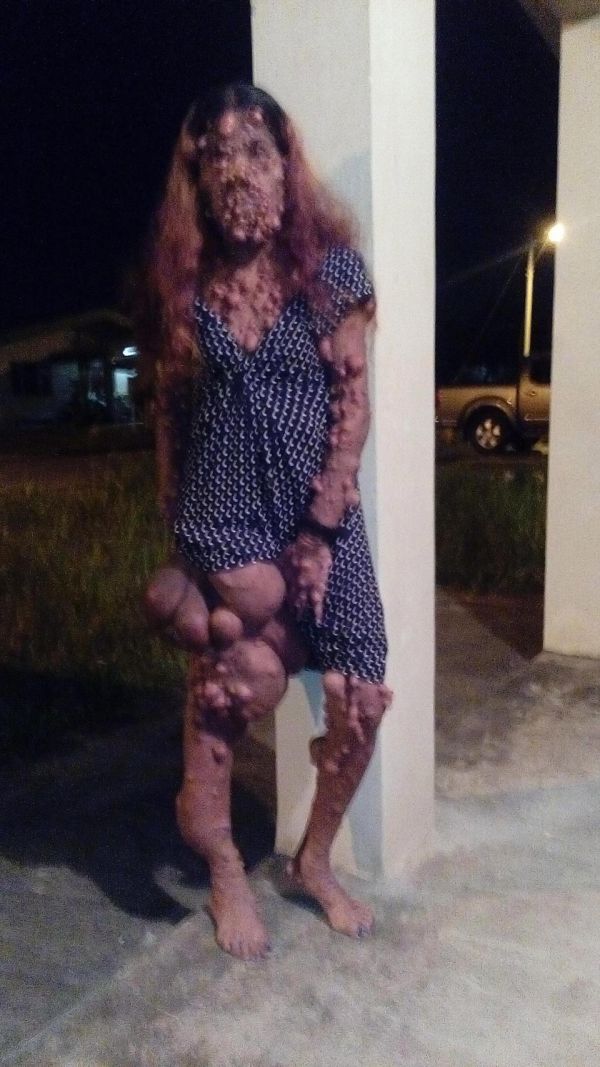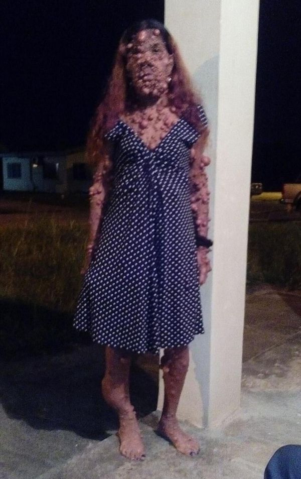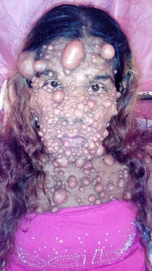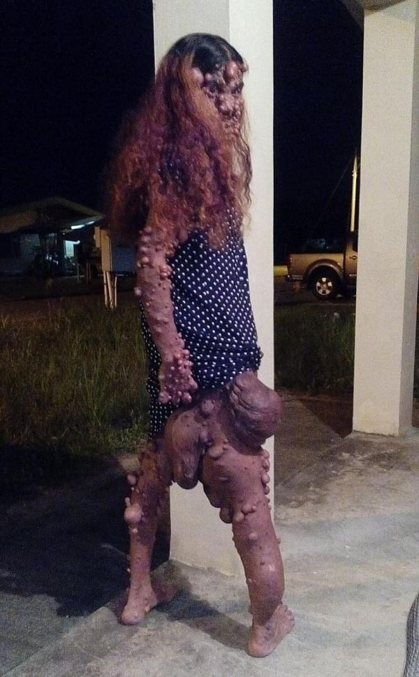 После рождения своего второго ребенка 38-летняя Шармен Сахадео покрылась огромным количеством опухолей (нейрофиброматоз) и стала выглядеть как персонаж фильма ужасов. Из-за аномалии 18-летний брак Шармен развалился, и с деньгами стало совсем худо, поскольку работодатели приходят в ужас от одного ее вида.