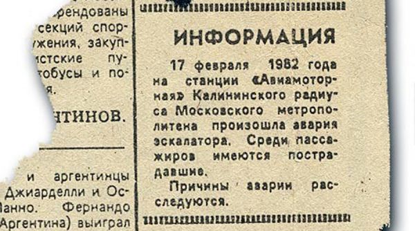 17 февраля 1982 года один из эскалаторов в московском метро дал сбой. Час пик, людей тьма, а лестница несется вниз с возрастающей скоростью. Тормоза, в том числе и аварийный, не сработали. Погибло 8 человек, не менее 50 оказались в больнице. Ну а вечером в газете появилась лишь заметка о незначительной поломке, без имен и количества жертв.