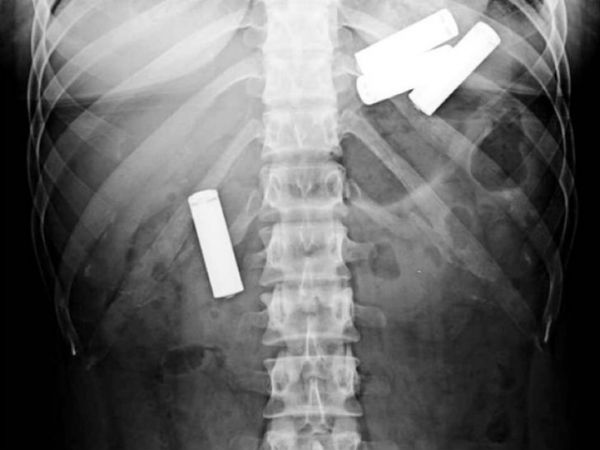 А так выглядит снимок человека, который проглотил немалое количество наркотиков, чтобы перевезти их контрабандой через границу.