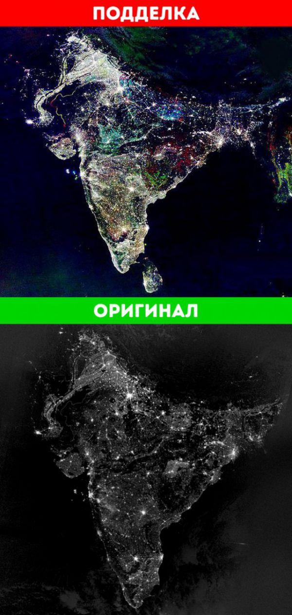 Цветной снимок со спутника разошелся по соцсетям с подписью: «Вот как выглядит Индия из космоса в ночь Дивали». После этого NASA опубликовало оригинальные черно-белые снимки, уточнив, что изображение было раскрашено в 2003 году ученым Крисом Элвиджем, чтобы показать, как изменилось освещение над Индией с 1992 года.