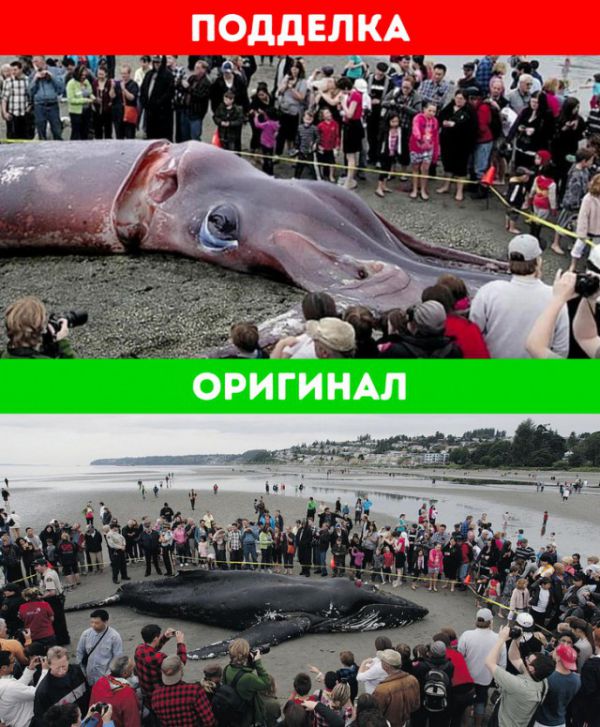 В марте 2015 года в сети появилась новость о гигантском кальмаре, которого выбросило на берег пляжа Пункайки в Новой Зеландии. Фотография оказалась очередной жертвой мастеров фотомонтажа. Оригинальный снимок был сделан в июне 2012 года на пляже Уайт-рок (Британская Колумбия, Канада), куда выбросило горбатого кита. Местные жители пытались спасти животное, но попытки оказались безуспешными.