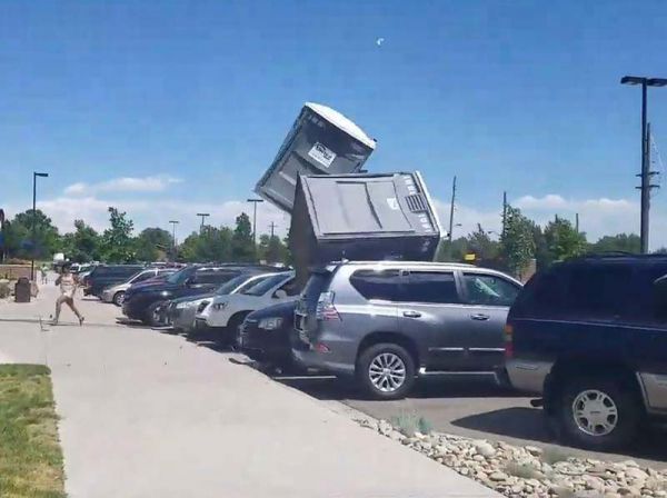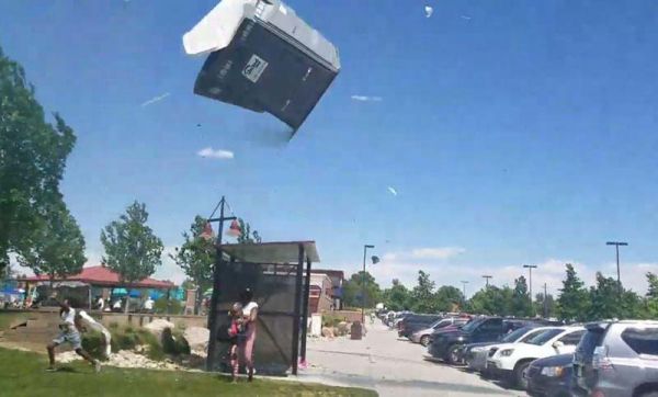 Недавно одному пользователю Facebook удалось заснять, как сильный ветер поднял в воздух два биотуалета.