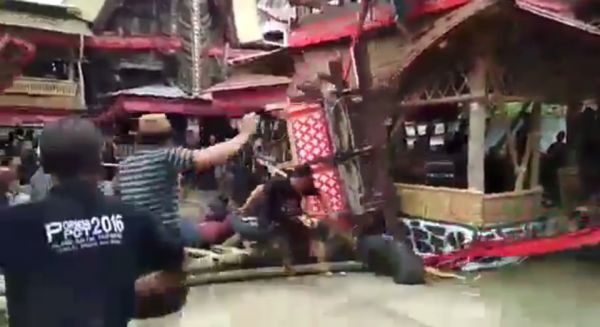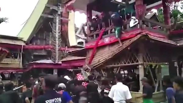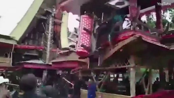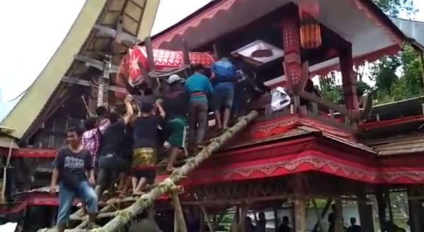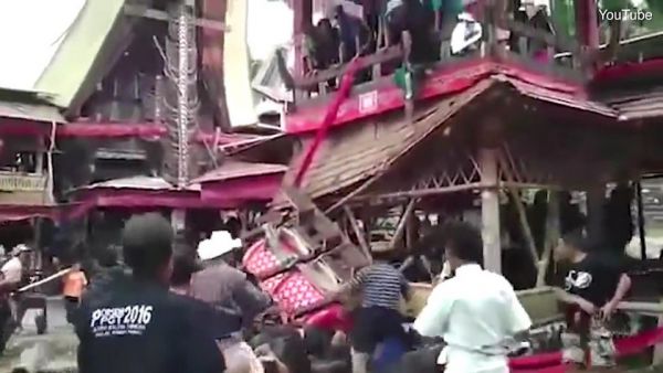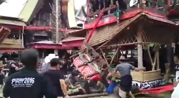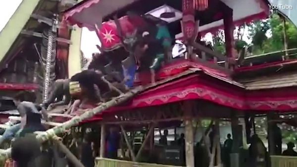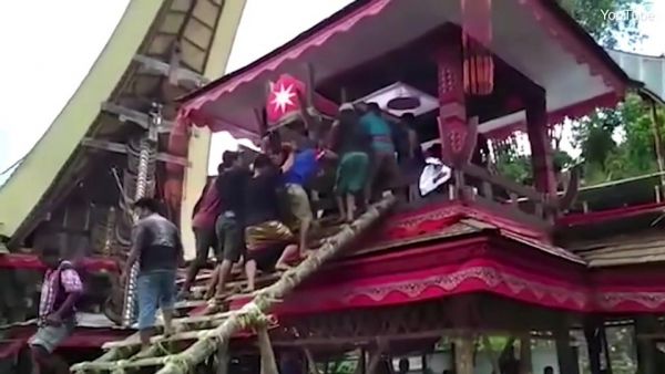 Трагедия произошла во время службы в индонезийской долине Париндинг, Северный район Тораджа. 40-летний Самен Кондорура нес гроб своей матери Берты по бамбуковой лестнице в похоронную башню. Неожиданно лестница соскользнула и гроб матери придавил сына. Свидетели происшествия пытались оказать помощь мужчине, но позже он скончался в больнице.