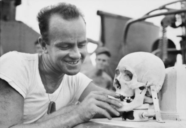 Младший лейтенант ВМС США Макферсон с японским черепом, служившим талисманом торпедного катера № 341