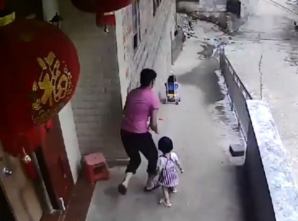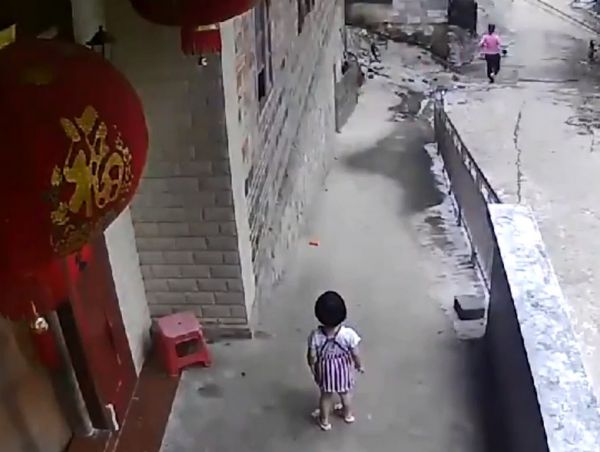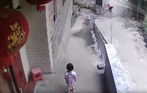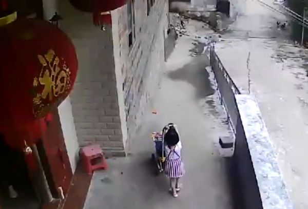 Это видео было снято камерой видеонаблюдения где-то в Китае. Пока мама закрывала входную дверь, ее дочь толкнула коляску с младшей сестрой вниз по бетонному спуску. Мать бросилась следом, но коляска быстро набирала скорость. Затем она попала в трещину в бетоне и перевернулась. Девочка выпала из коляска, но не пострадала, отделалась испугом.