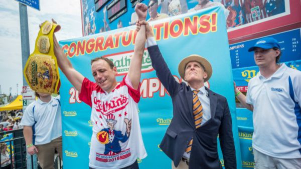 В прошлом году Джоуи Челюсти съел 72 хот-дога, но на этот раз он потренировался, развил необходимые навыки и на конкурсе в Нью-Йорке смог осилить 74 хот-дога. Кстати, он побеждает уже в 11-й раз.