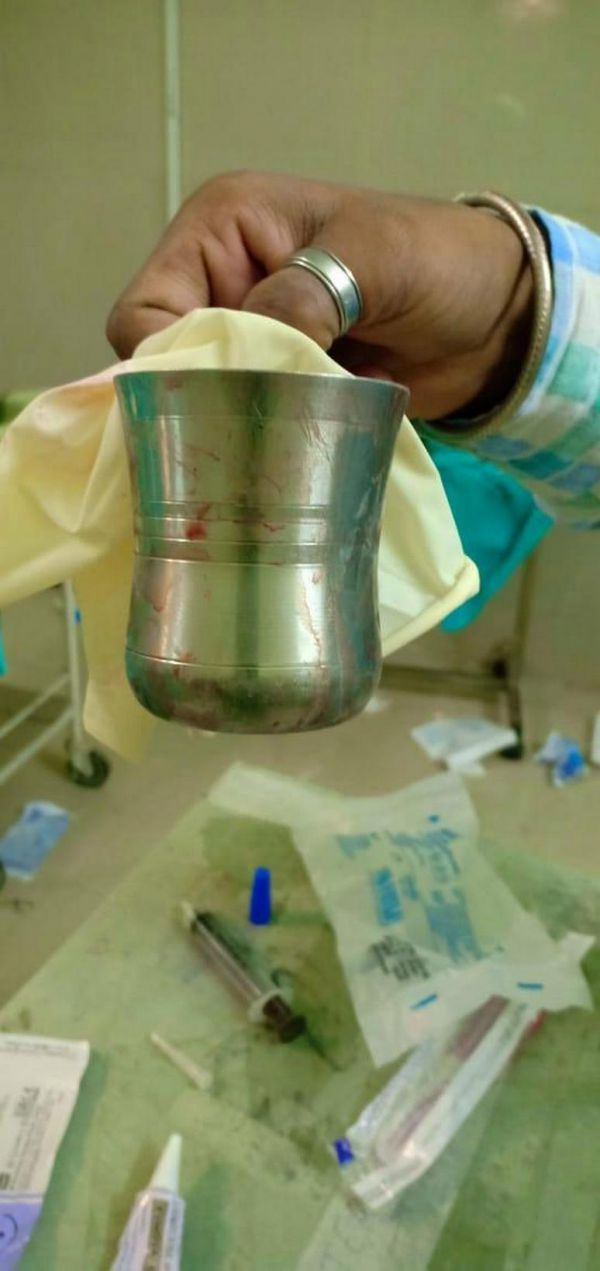 62-летний охранник по имени Рамдин подвергся вооруженному нападению. Грабители похитили денежные средства в размере $700 и засунули пожилому мужчине в задницу металлическую чашу. В ходе истязаний индус потерял сознание и многого не помнил. Через 10 дней он обратился в больницу Рама в городе Канпур, Индия, с сильными болями в области живота. Мужчине провели ультразвуковое сканирование, чтобы выяснить причину болей, и были поражены, увидев стальной стакан, застрявший в области живота. Изначально врачи пытались удалить чашу через сам анус, но через час, несмотря на все их усилия, не смогли этого сделать. Кубок был удален через желудок после двух часов кропотливой инвазивной операции.