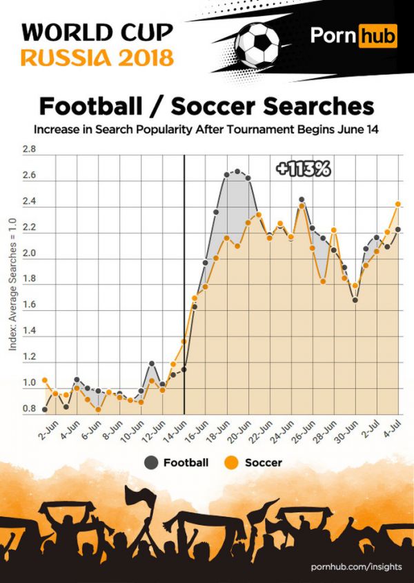 Пик популярности "футбольного" порно пришелся на начало чемпионата мира. Так, 18-20 июня количество подобных запросов превышало на Pornhub обычные показатели примерно в 2,7 раза.