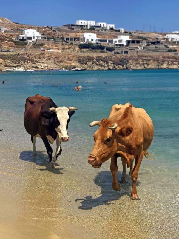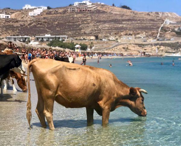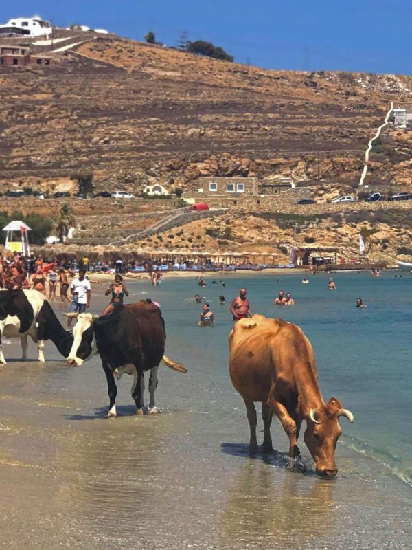 Отдыхающие загорали на одном из самых популярных пляжей острова Миконос, Греция, когда идиллию нарушило дерзкое стадо коров. Животные охлаждались и резвились в воде, пока их не выгнали. Появление коров вызвало фурор среди туристов: они толпились вокруг и фотографировали нежданных гостей, хотя некоторые запаниковали.