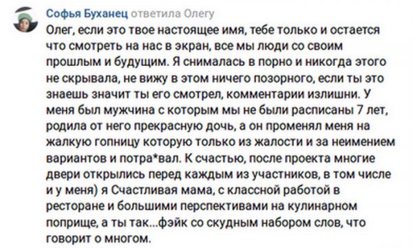 "Все мы люди со своим прошлым и будущим. Я снималась в порно и никогда этого не скрывала, не вижу в этом ничего позорного", - ответила Буханец на комментарий одного из своих хэйтеров, отметив, что является счастливой матерью.