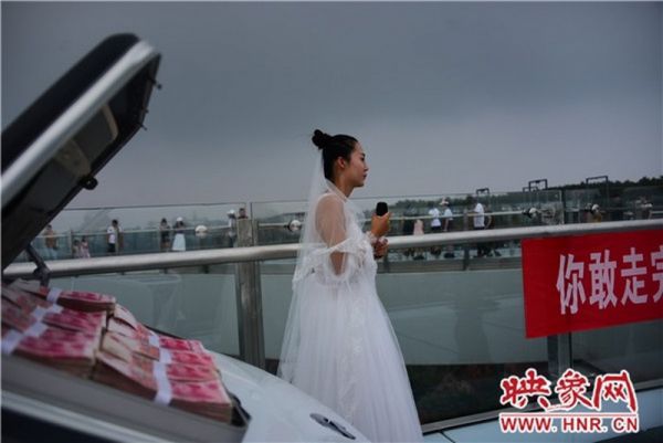 Девушка в свадебном платье загнала на стеклянный мост новый внедорожник, поставила на капот набитый деньгами чемодан (14 500 долларов) и предложила парню себя и приданое, если он преодолеет свой страх — пройдет по мосту. Бойфренд, которого ненавязчиво к месту предложения привели друзья, к такому повороту оказался не готов. Правда, он попытался побороть свою фобию, но в итоге плюнул и ушел, назвав свою невесту безответственной.