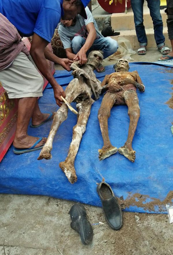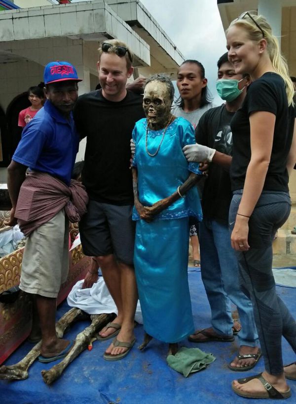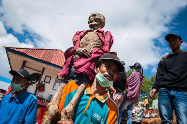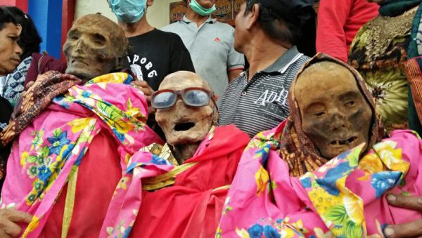 У народа тораджи, обитающего на индонезийском острове Сулавеси, существует странная традиция ежегодно выкапывать трупы умерших родственников. Тела моют, переодевают, ремонтируют или заменяют гробы. Затем их проносят по улицам, при этом нельзя плакать и грустить, нужно веселиться и улыбаться. После прогулки жители жертвуют буйволов и свиней в качестве подношения за беспрепятственный вход мертвых в рай. Эта странная традиция привлекает множество туристов из разных стран, которые с удовольствием фотографируются с трупами.