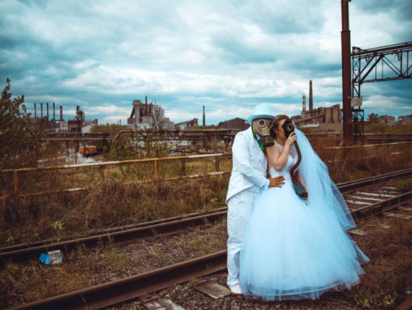 Для своей свадебной фотосессии пара хотела подготовить что-нибудь необычное, ведь сниматься на фоне голубков и ленточек им показалось унылым. Результатом креатива стал фотосет под названием: «Суровый Челябинск — суровые свадьбы! или Милая, надень противогаз!»