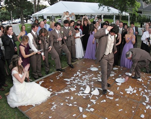 Битье посуды по сравнению с предыдущими традициями – это просто легкая шалость. Гости на классической немецкой свадьбе приносят в дар фарфоровую посуду, после чего торжественно разбивают ее в разгар торжества. Принято считать, что подобный акт позволит отогнать злых духов от молодых, сделать их брак надежнее и крепче. Еще бы не закалиться, ведь именно молодым предстоит убрать всю разбитую посуду, работая бок о бок на благо будущего процветания. Также польтерабенд (название традиции) иногда проводится во время вечеринки накануне ответственного дня. Разбивая посуду, гости желают молодым удачи и стойкости перед трудностями совместной жизни.