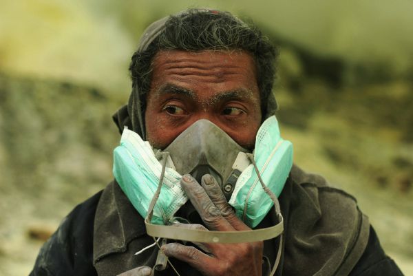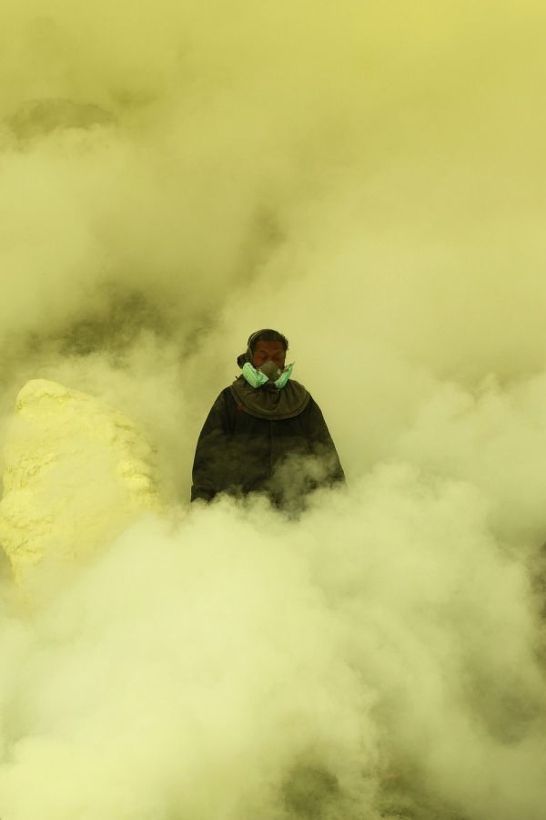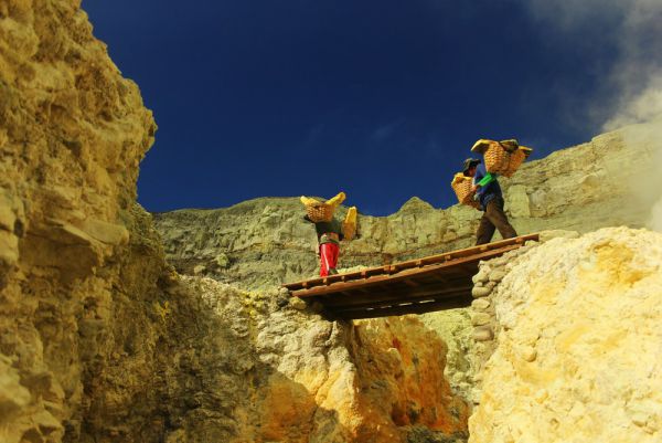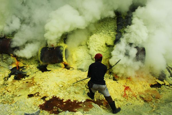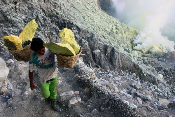 Ежедневно около 200 шахтеров спускаются в кратер вулкана Кава Иджен, Индонезия, где находится красивое, но смертельно опасное озеро с серной кислотой. Работяги ломами добывают здесь куски затвердевшей серы среди плотного одеяла токсичных паров, а затем грузят добытый минерал в корзины и тащат по предательски крутой горной тропе на соседний завод. За 12-часовой рабочий день они получают $7,8 и кучу болячек в придачу.