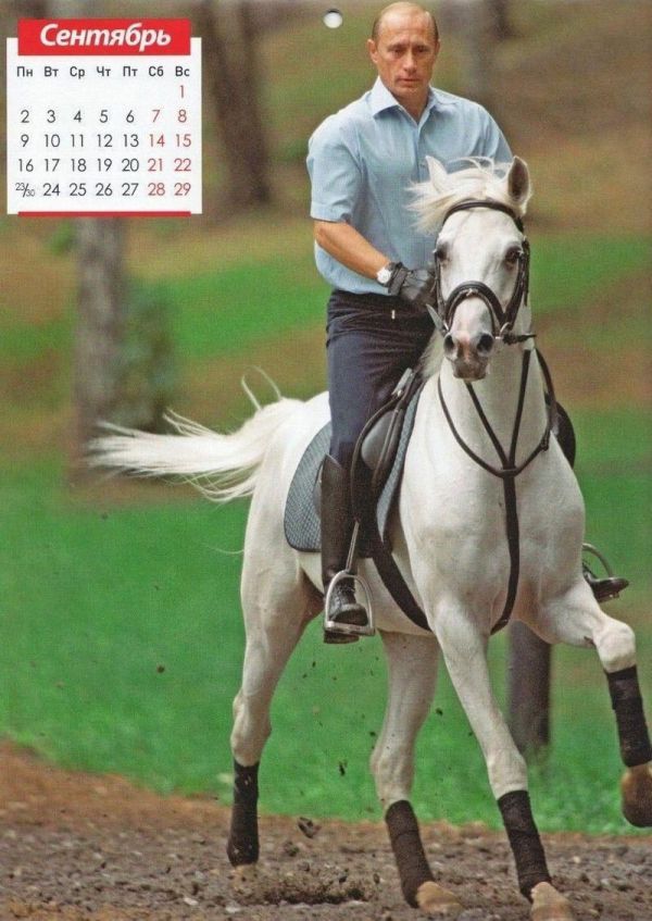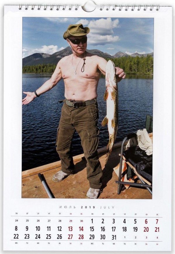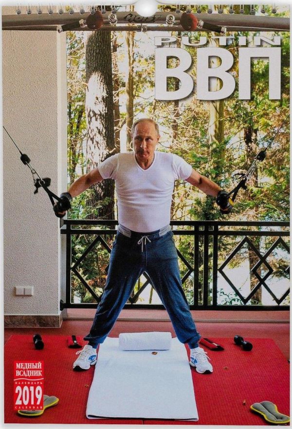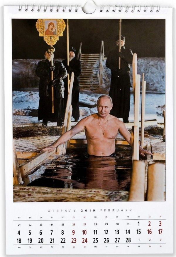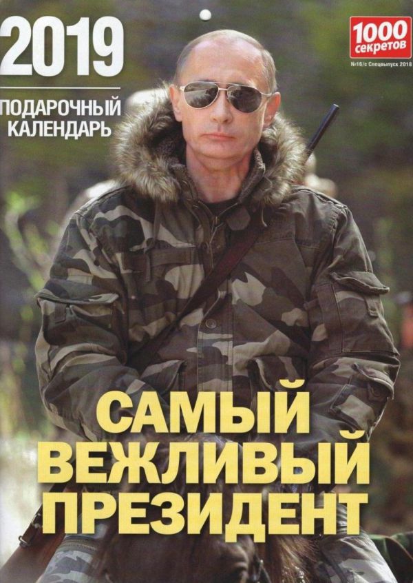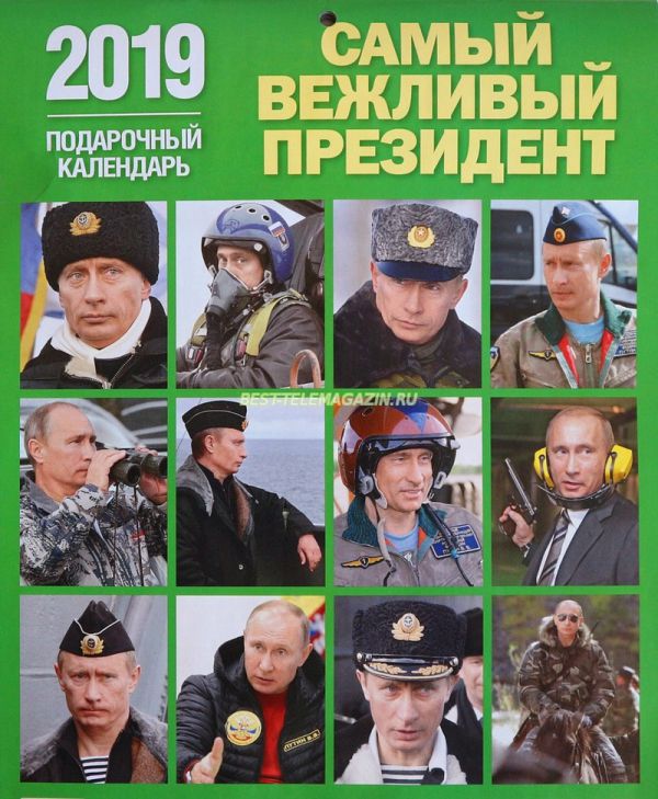 На полках российских магазинов и в интернете появился календарь с Владимиром Путиным на 2019 год «Самый вежливый президент». На страницах календаря президент России стреляет из пистолета, скачет верхом на лошади, занимается спортом, позирует с животными, с голым торсом ловит рыбу и купается в проруби. Несколько экземпляров календаря уже появились на eBay, за них просят около $15.