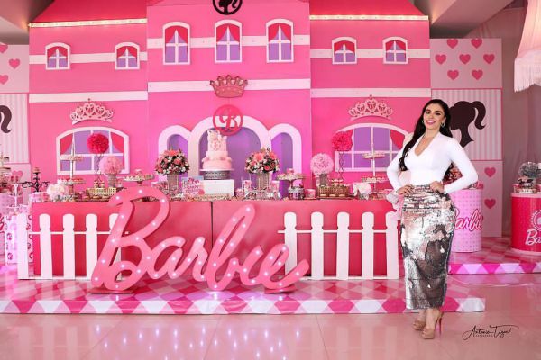 Большой зал с люстрой был переоборудован в гигантский розовый дом Барби в комплекте с тортом, пирожными и персонализированными бутылками воды.