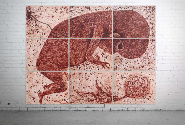 Румынская художница Тими Пал нарисовала на холсте своего будущего ребёнка при помощи пальцев, тампонов и собственной менструальной крови. Полотно создавалось на протяжении 9 месяцев и состоит из 9 отдельных частей, которые собираются в одну. Зачем она это делает?