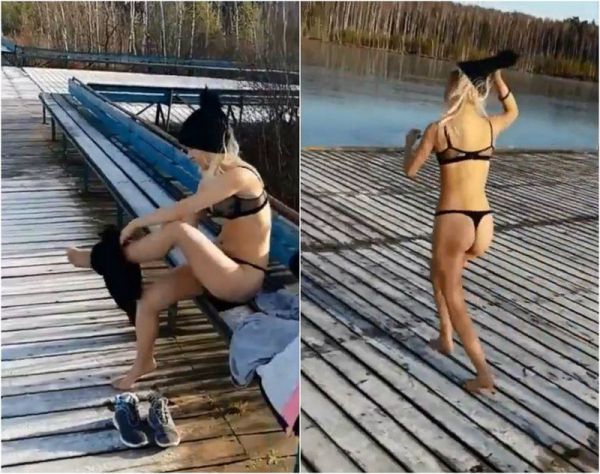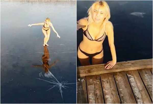 Белокурая девушка разделась до нижнего белья и хотела эффектно прыгнуть в замерзшее озеро. Она пригласила оператора, чтобы тот запечатлел это действо на видео. Но все пошло не по плану: лёд оказался крепкий, девушка удалилась ногой и задницей, но замерзшую поверхность не смогла пробить. С гримасой боли на лице она попросила оператора помочь выбраться, а позже у девушки обнаружили перелом лодыжки. Судя по разговорам в видеоролике, действия происходят где-то в России.