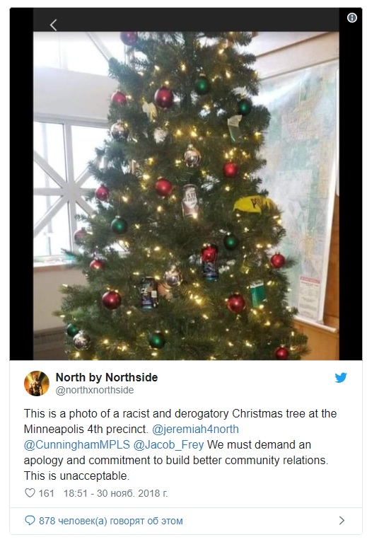 Некоторые пользователи сети решили, что товары на елке обычно ассоциируются с темнокожим населением США - тем самым полицейские якобы посмеялись над значительной частью жителей Миннеаполиса.