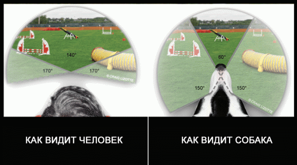 В свою очередь если человек не шевелится, то собака может не заметить его и на расстоянии в 100 м, пока не обнаружит по запаху. Особый интерес представляет периферийное зрение собак. В целом угол зрения у них шире, чем у нас, однако поле, в котором животные видят лучше всего, – уже. Это опять же связано с эволюционным развитием: хищник должен смотреть прямо перед собой и сконцентрировать основное внимание на добыче. Однако и совершенно упускать из вида то, что происходит вокруг, также не стоит.