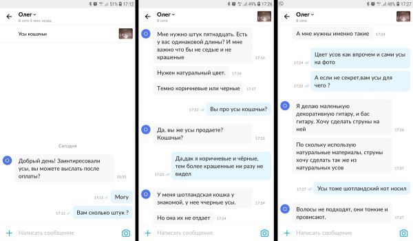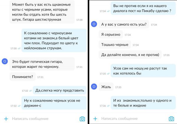 Как оказалось, покупатель Олег намеревался сделать из усов струны для "готической гитары", которая "жарит по черному". Именно поэтому музыканту не подошли предлагавшиеся ему белые вибриссы.