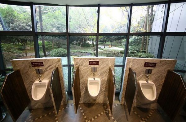 Что больше всего впечатляет, так это стеклянная стена, которая позволяет посетителям писсуаров любоваться зеленым парком, пока они заняты своими делами. Стекло прозрачное только изнутри, а с внешней стороны смотрится как зеркало.