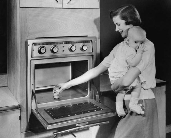 Первая микроволновая печь была разработана американским инженером Перси Спенсором, проектировщиком военных радаров. В 1945 г. печи массово стояли в военных столовых американской армии. Прибор высотой со взрослого человека и массой 300 кг применялся для быстрой разморозки мяса.