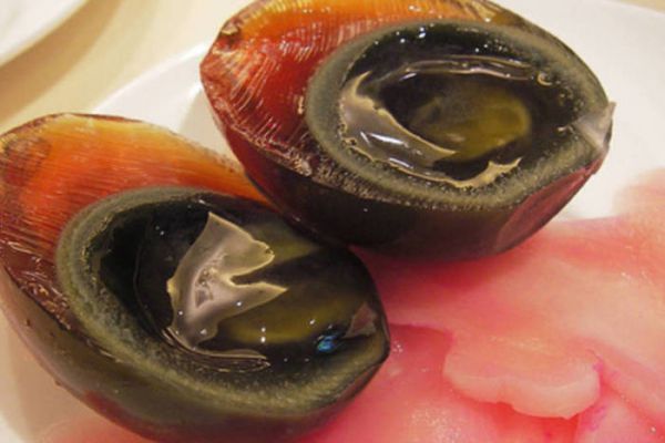 Pidan – популярная китайская закуска. Вот это вот странное на вид блюдо, ничто иное, как состаренное яйцо, по словам местных кулинаров, оно вообще никогда не портится. Но судя по запаху, кое-кто преувеличивает в «свежести» блюда.