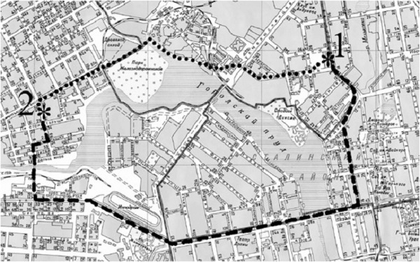 Карта Свердловска с отмеченными на ней первыми двумя местами похищения детей