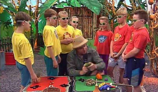 Дети лазили по канатам, взбирались на высокие горы. Если в конкурсе побеждала команда «травоядных», им бросали банан (конечно же бутафорский), когда «хищники» — кость.