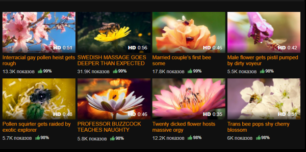 Видеохостинг PornHub запустил отдельный раздел с видео, где пчелы опыляют цветы. Пчел озвучили порноактеры. За каждый просмотр сервис будет переводить деньги на благотворительность.