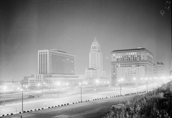 Центр Лос-Анджелеса освещен взрывом атомной бомбы, 1955 год