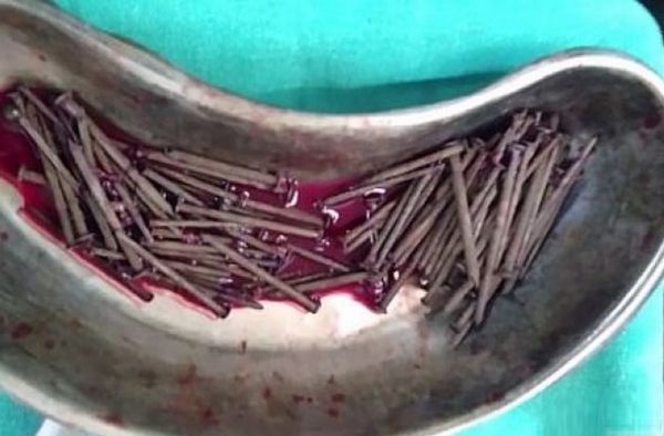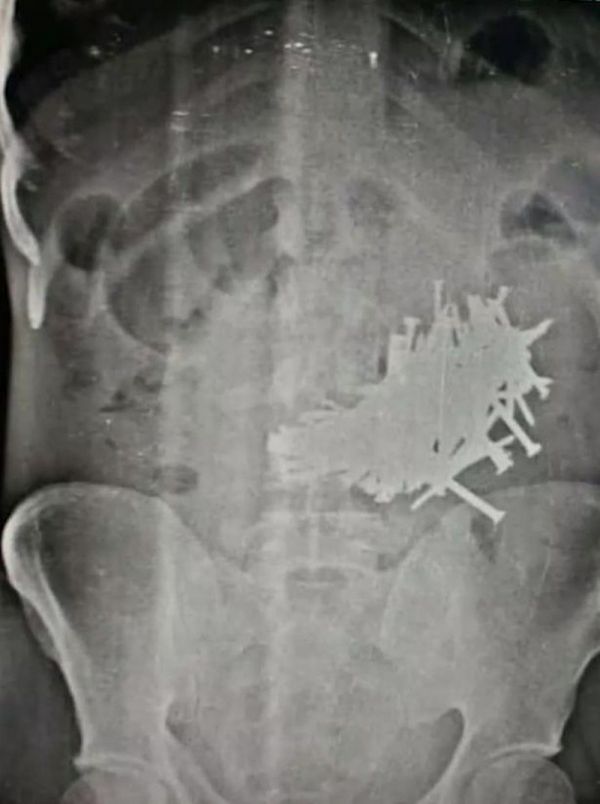 В больницу индийского штата Раджастхан доставили 43-летнего Бхола Шанкар, страдающего от сильных болей в животе. Оно и не удивительно — рентген показал наличие в его кишечнике огромного количества гвоздей.