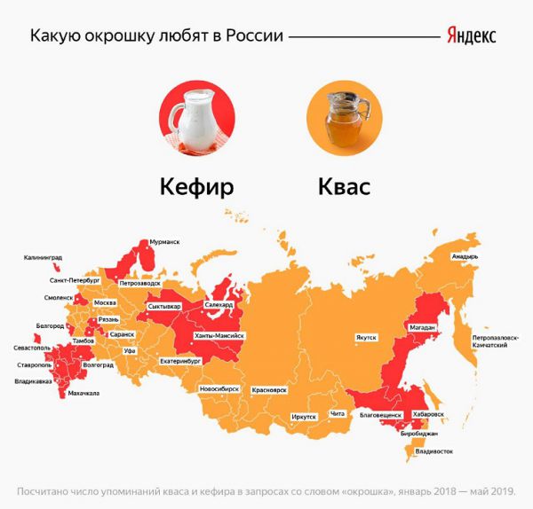 Недавно специалисты Яндекса провели исследования по поводу предпочтений вариантов изготовления окрошки и получили вот такую карту.