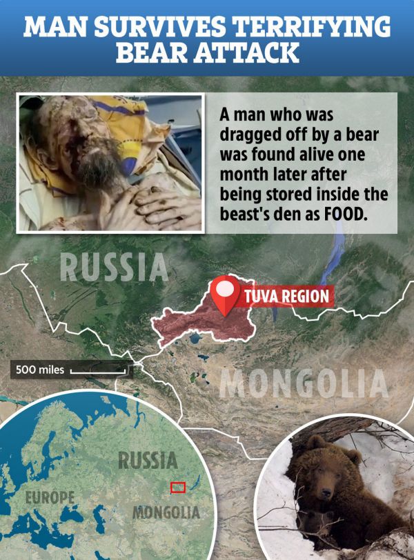 Мужчина, больше похожий на «мумию», был найден живым в берлоге медведя спустя месяц после того, как зверь напал на него, сломал позвоночник и утащил в своё логово в качестве будущей еды.